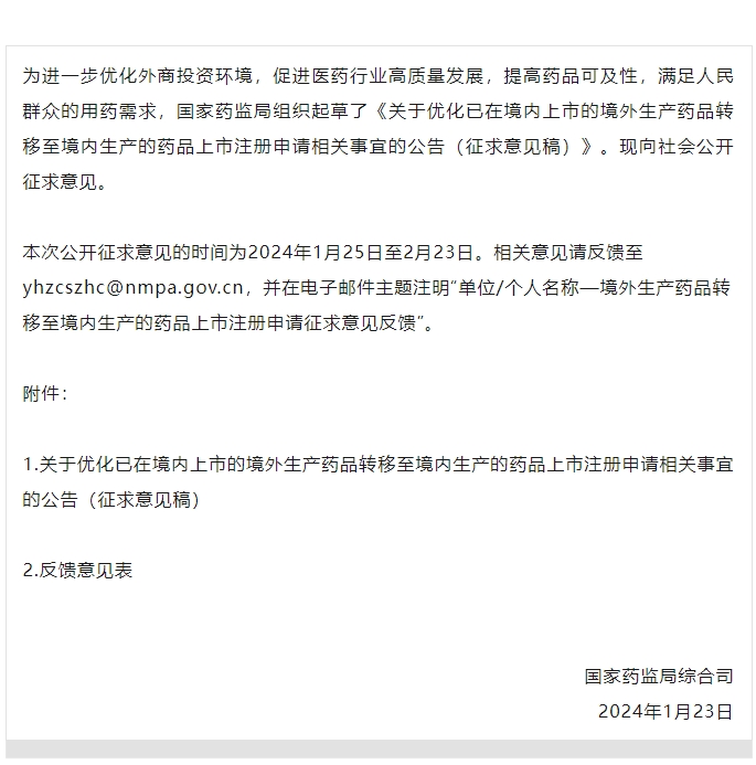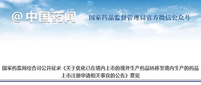 国家药监局综合司公开征求《关于优化已在境内上市的境外生产药品转移至境内生产的药品上市注册申请相关事宜的公告》意见