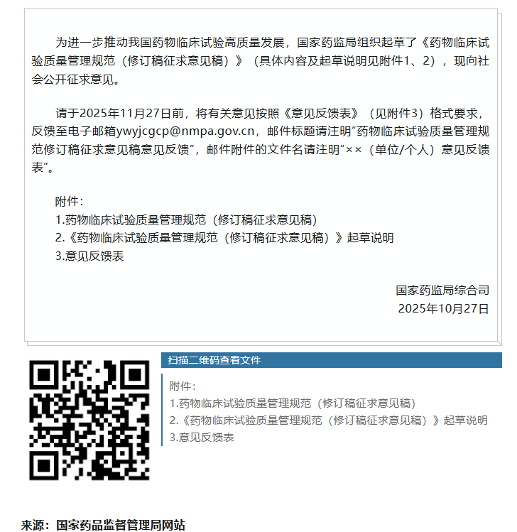 国家药监局综合司公开征求《药物临床试验质量管理规范(修订稿征求意见稿)》意见