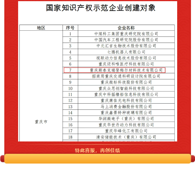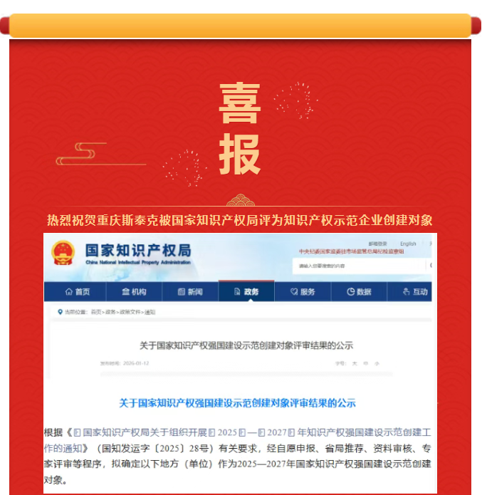 热烈祝贺重庆斯泰克被国家知识产权局评为知识产权示范企业创建对象