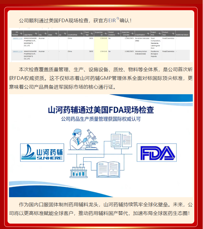 重磅!山河药辅顺利通过美国 FDA 现场核查,全球化布局再迎里程碑!