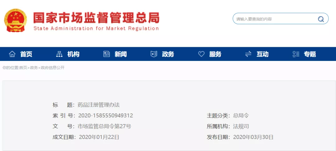3月30日,国家市场监督管理总局官网公布2020新版<药品注册管理办法>。这是既2007年10月原国家食品药品监督管理局发布<药品注册管理办法>(局令第28号)13年之后再次更新。一同公布的还有<药品生产监督管理办法>,两部规章将于2020年7月1日起正式施行。